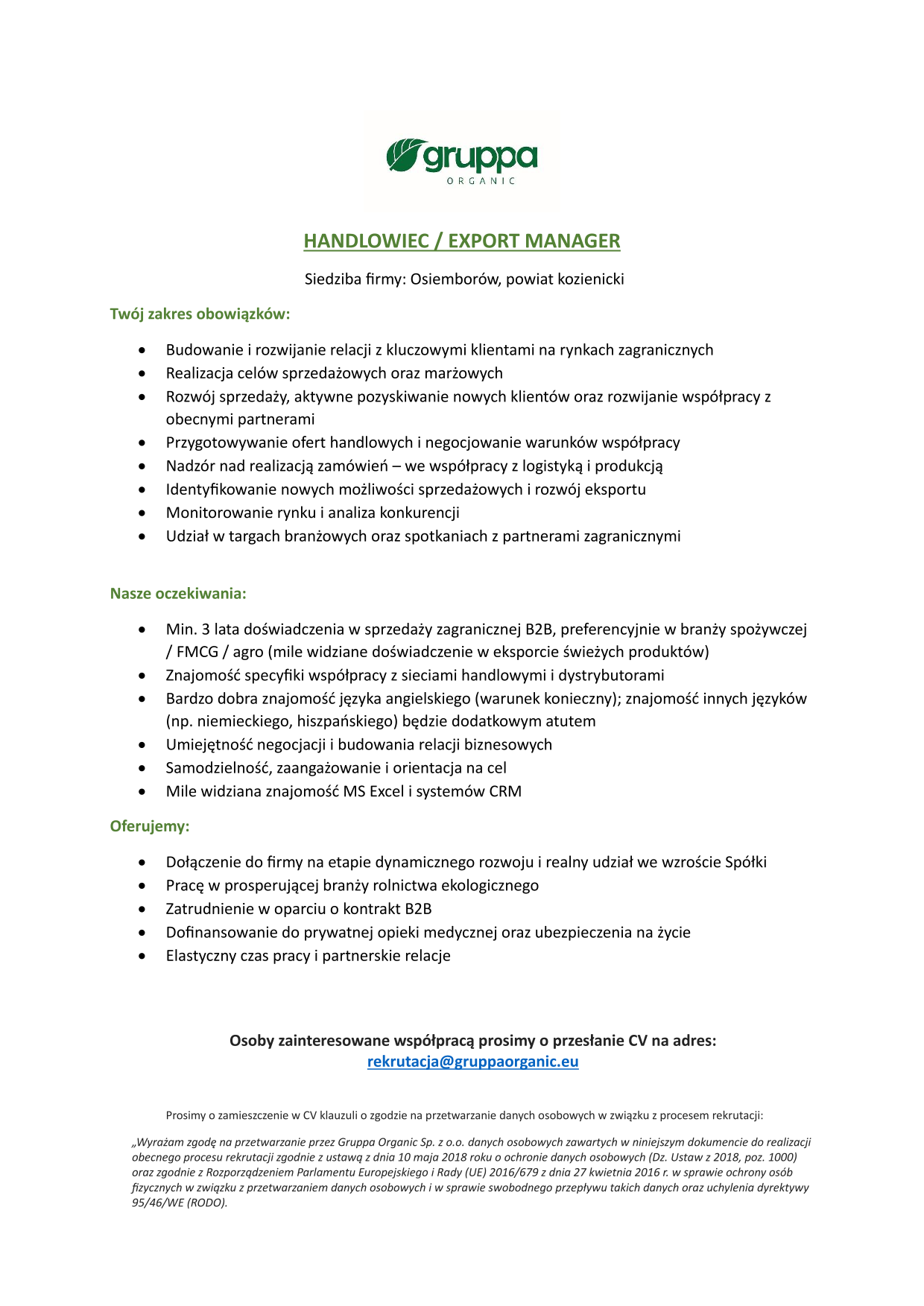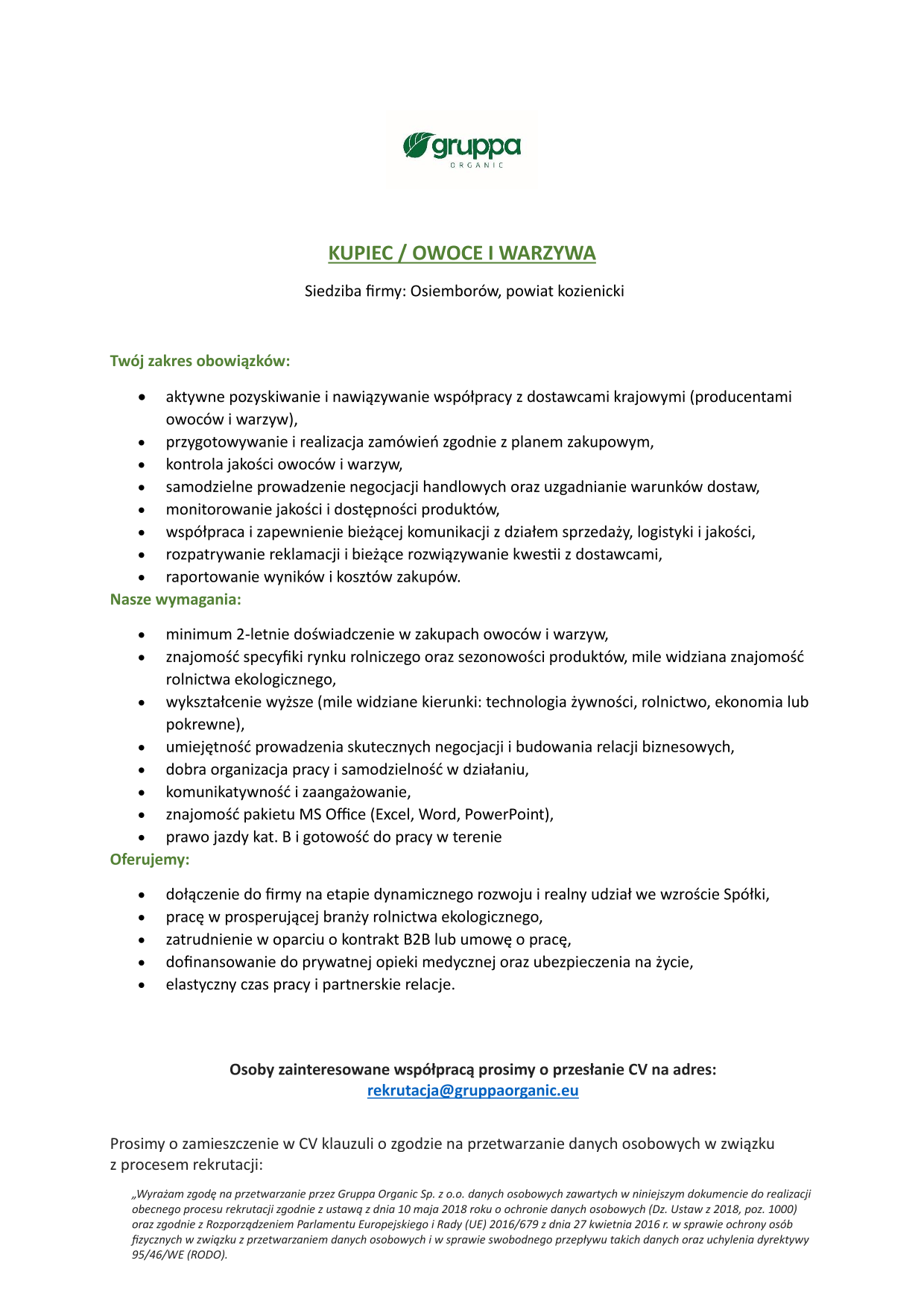 Wyślij aplikację na email: rekrutacja@gruppaorganic.eu